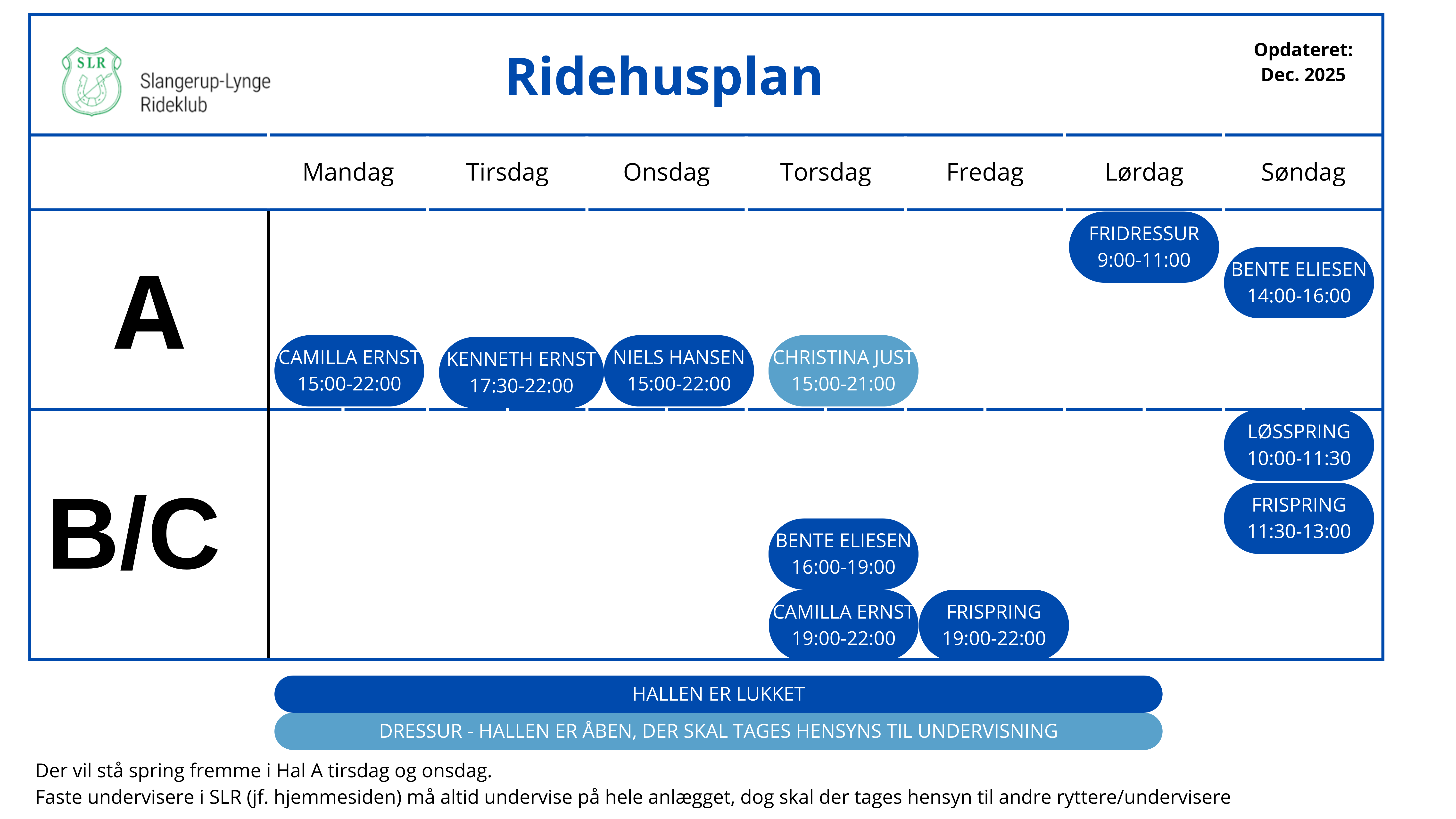 Vær opmærksom på, at alle der underviser på SLR skal være gyldig medlem af klubben. Privat undervisning er kun tilladt i hallerne frem til kl. 15.00.